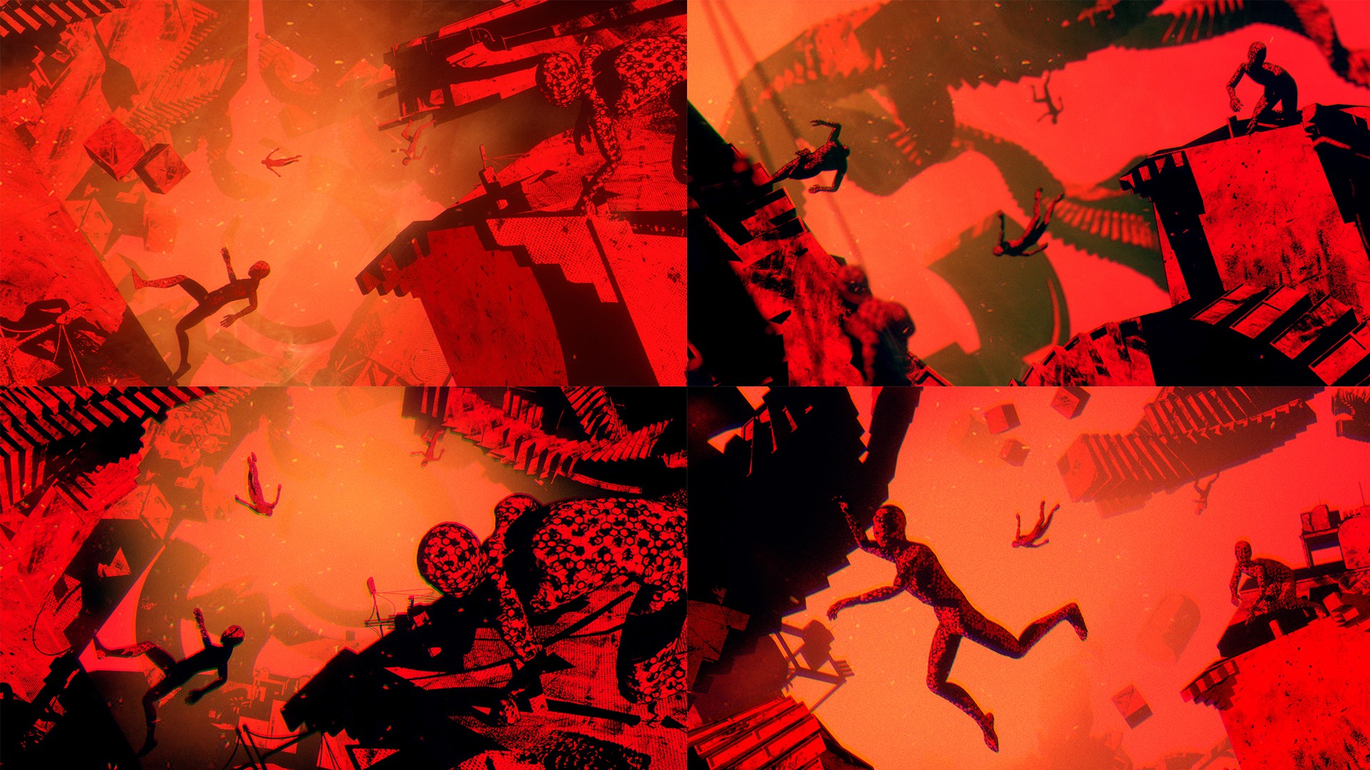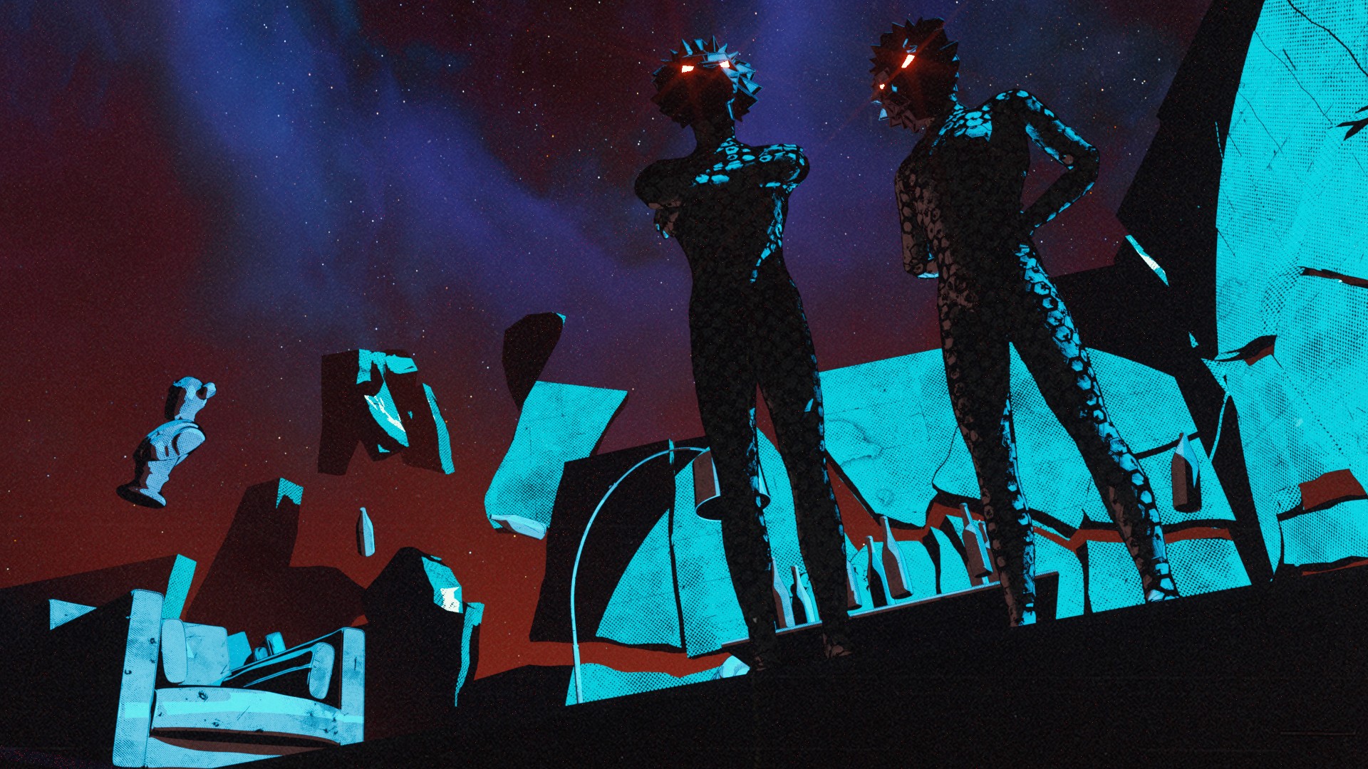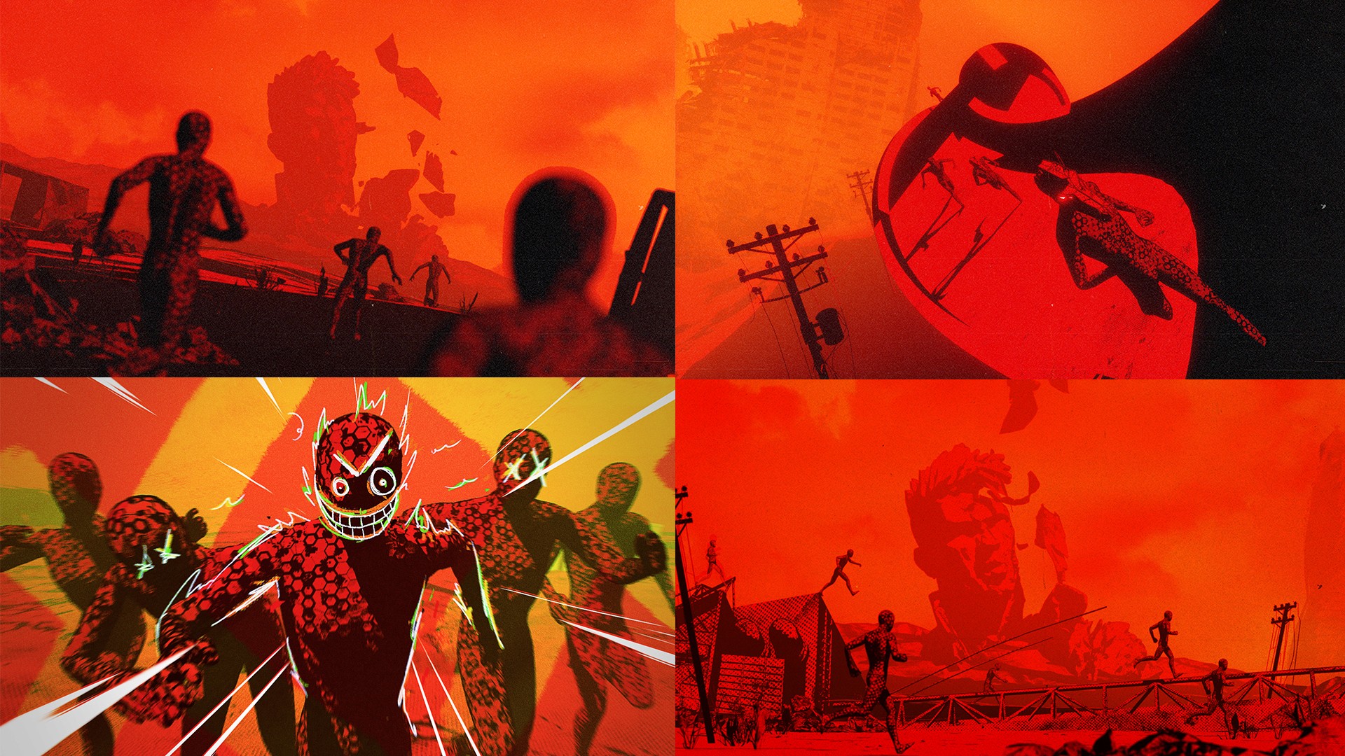 My job was to set the look and feel of the project. I explored rendering style including seeing how far the toon shading could be pushed within C4D at the time. I used Octane Render for these design frames as I felt it had stronger capabilities (this was before Redshift updates to their toon shading). We had a bit of fun with the Dalí-esque cityscape, where we built out a whimsically distorted melty wasteland with twisted buildings. It offered the perfect setting for the band of psychopaths to traverse as they attempt to claw their way to victory.